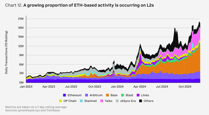 尽管如此,从增加区块空间和降低成本的角度来看,l2s取得了一定的成功。在2024年3月的以太坊dencun (deneb+cancun)升级中引入blob交易,将平均l2成本降低了90%以上,并使以太坊l2s的活动增加了10倍。此外,多种执行环境和体系结构能够在基于eth的环境中进行实验,这是以l2为中心的方法的一个长期优势。