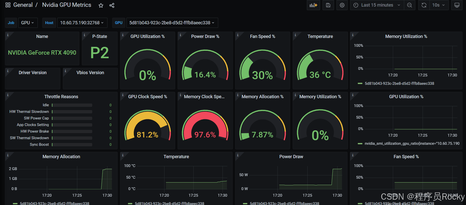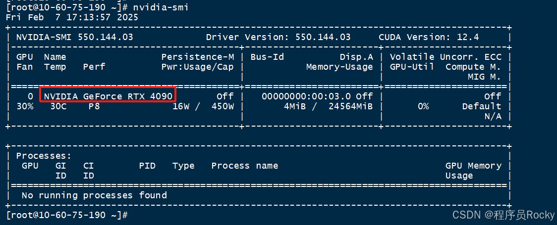 面板可以看到gpu的型号是rtx 4090、显存的使用情况等指标, 此时我正在服务器运行deepseek-r1:1.5b的模型,所以看到gpu的相关使用。如果将模型停止运行,则gpu基本上无占用