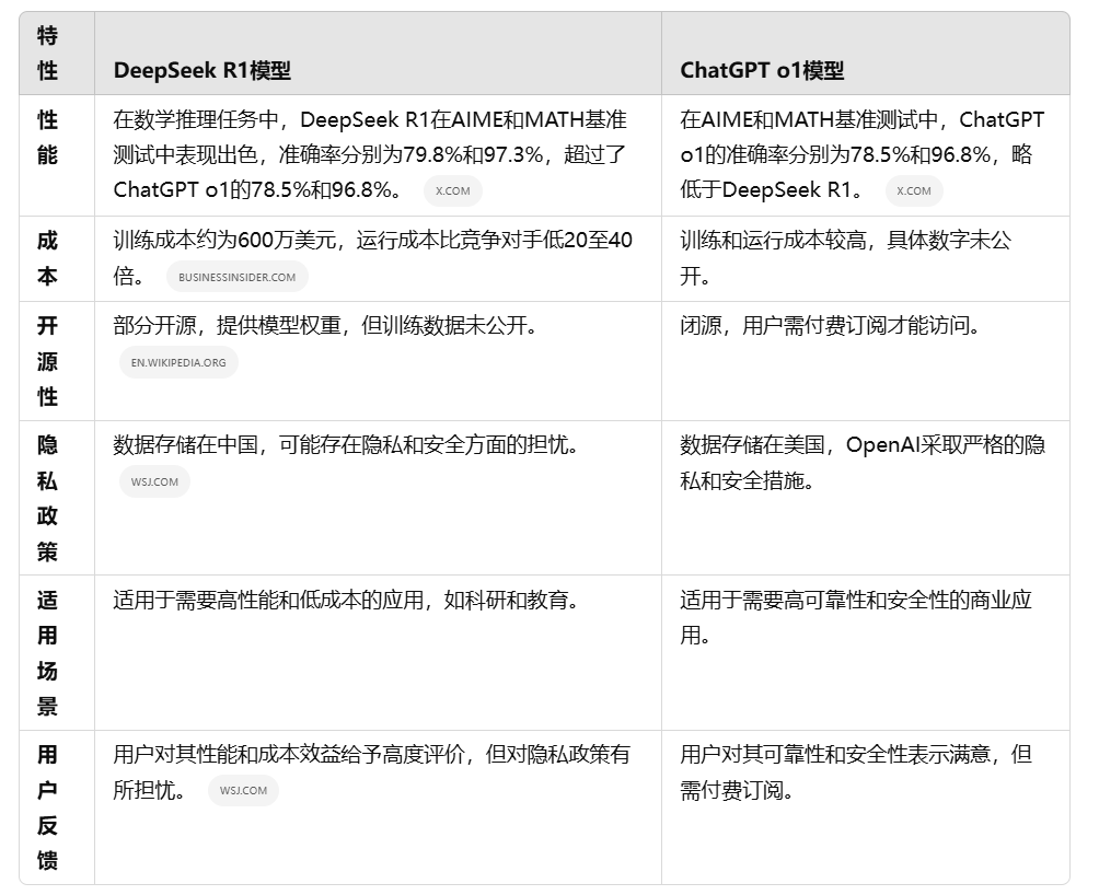 总体而言,deepseek r1在性能和成本方面具有优势,适合对成本敏感的应用;而chatgpt o1在可靠性和安全性方面更为出色,适合对隐私和安全有高要求的场景。