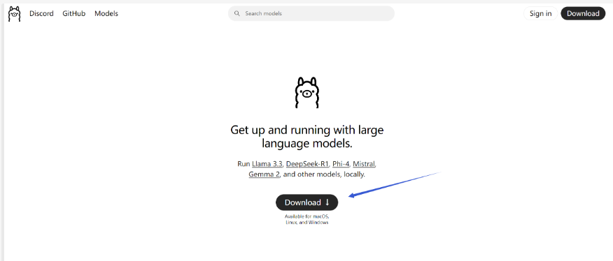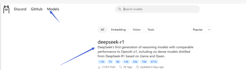 接下来我们进行部署deepseek r1模型的操作,我们依旧打开ollama的官网,可以看见左上角有一个models的选项,我们点击下