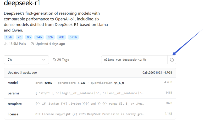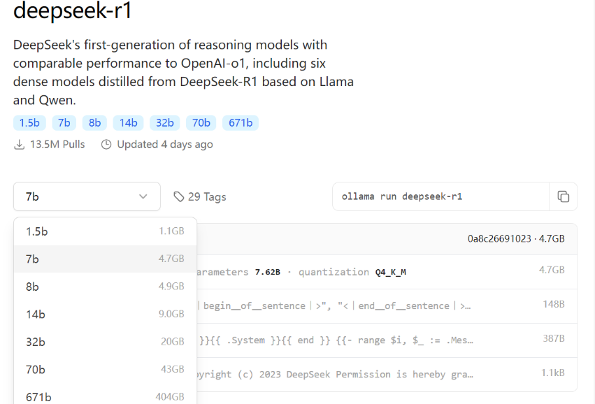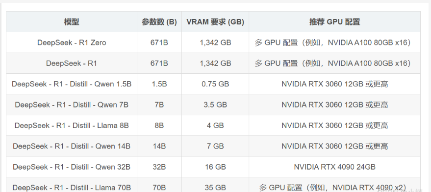 选择deepseek-r1,这里的话有很多模型,我们可以根据自己电脑的显卡配置进行选择相应的版本,以下是模型与配置的建议