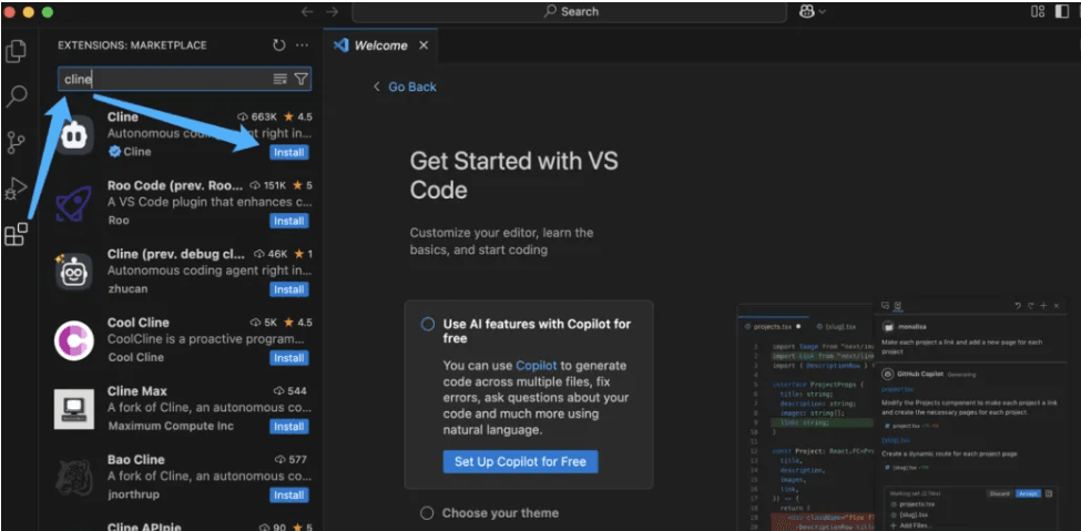 打开vscode,点击左侧菜单,搜索并选择安装名为“cline”的插件。插件安装后,它会出现在左侧菜单中。