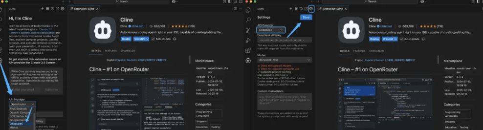- 选择已经安装好的cline插件,配置api接入源为deepseek。