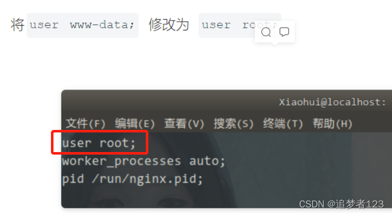 - 将/etc/nginx/nginx.conf中的第一行改为root