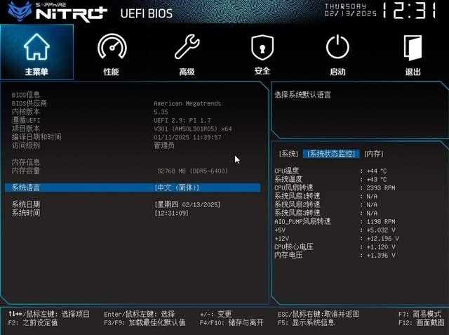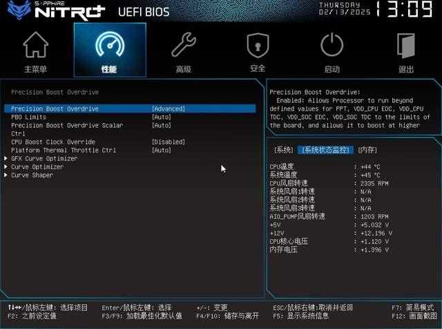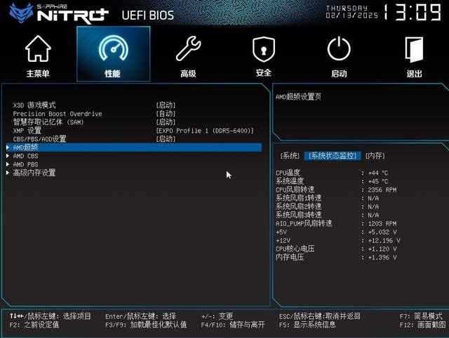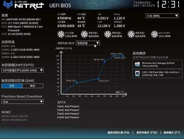下面我们来看一下蓝宝石nitro+ 氮动 b850m wifi主板的bios,目前蓝宝石主板已经升级为图形化菜单,进入主菜单来到简易模式可以看到xmp/expo、pbo、风扇这些快捷预设选功能,并能查看一些硬件参数信息。