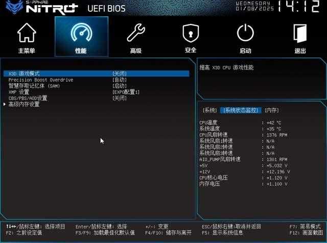 接着来到重要的性能页面,可以看到针对x3d处理器的游戏模式开关,以及pbo、内存等功能调节。