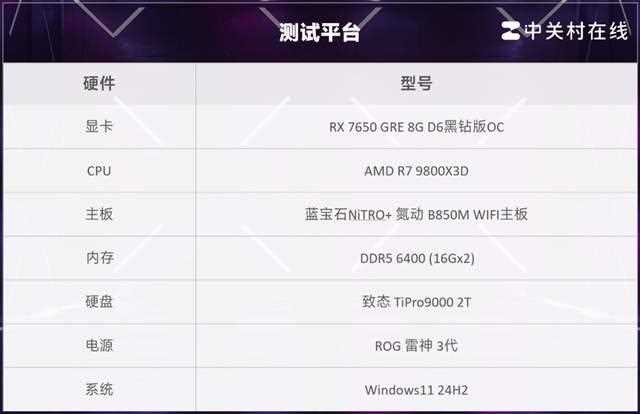 本次测试搭配了最新推出的蓝宝石rx 7650 gre 8g d6黑钻版oc显卡,该显卡拥有2048个流处理器,采用rdna3架构,navi 33核心,拥有8gb gddr6显存,显存位宽为128 bit,带宽为288 gb/s。boost频率为2810mhz,标频为2695mhz,有较大提升。从配置规格来看,非常适合1080p分辨率下的游戏。