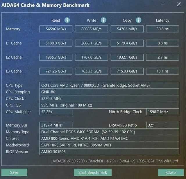 我们首先针对蓝宝石nitro+ 氮动 b850m wifi主板进行内存方面的测试,先看一下expo 6400内存在这款主板上的性能表现。