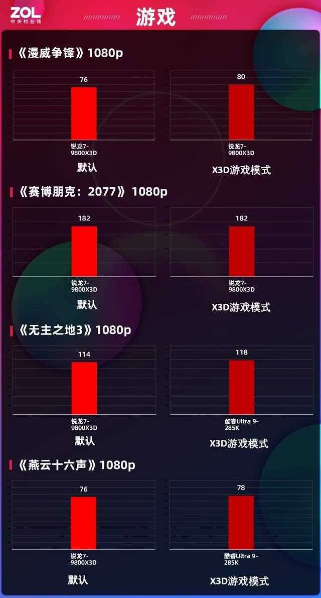 搭配蓝宝石rx 7650 gre 8g d6黑钻版oc显卡这套平台在1080p分辨率下,《漫威争锋》达到76帧,《赛博朋克:2077》达到182帧,《无主之地3》达到114帧,《燕云十六声》达到76帧。而在开启了蓝宝石nitro+ 氮动 b850m wifi主板的x3d游戏模式,《无主之地3》、《漫威争锋》以及《燕云十六声》这三款游戏帧数均有一定上涨,fssr3模式下的《赛博朋克:2077》帧数没有任何变化,对于吃cpu原生帧数的游戏,这项功能可以带来一点收益。