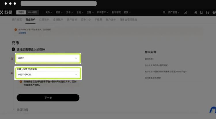 1. 点击右上角【资产管理】—选择【充币】,选择您需要充入的币种【usdt】—选择 usdt 可用的充币网络【usdt-erc20/usdt-trc20/usdt-oktc】—【下一步】注意:选择充值 usdt 币种时,此地址只能充入 tether (usdt),请勿充入其他币种,否则您充入的资产将无法找回。