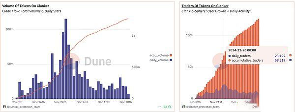 比如 clanker,作为 base 生态上的 ai agent 明星项目,可以从链上数据可以看到在 11 月 26 号之后,无论是发行的代币数量、交易者还是链上收入都开始下滑,而这样的趋势也立即反应在了代币价格上。