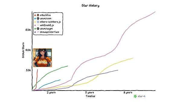 如上图所示,可见 ai16z/eliza 的开发者关注度,在短短一个月时间超过了 uniswap。可见开发者对这一框架的兴趣程度。另外一组数据也可以进行对比:sui 目前是 6400 个 stars ,solana 1.3 万个 stars ,以太坊 5 万个 stars ,base 7 万个 stars 。