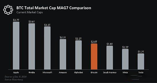 比特币的市值仅为美国科技七大巨头(苹果、英伟达、微软、亚马逊、谷歌、meta、特斯拉)总市值的11%。