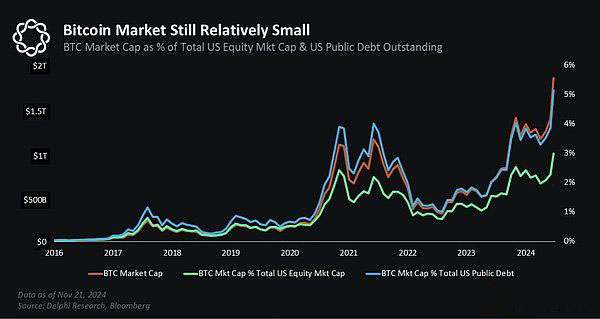 其整个市值仅占美国未偿公共债务总额的5%,不到全球债务总额(公共债务+私人债务)的0.7%。