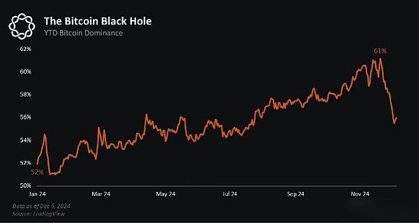 第一点原因是比特币的主导地位。在etf流动和特 朗普支持的推动下,比特币经历了非凡的一年,导致今年迄今价格上涨超过130%,并将其主导地位提升至三年来的高点。