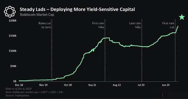 缺失的要素——稳定币增长和信贷扩张——开始重现。较低的利率和更友好的监管预计将刺激投机行为,解决这些失衡问题。随着稳定币重新获得牵引力,它们的交易和抵押品基础作用将对市场复苏至关重要。