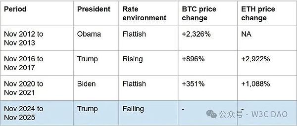 在以上背景下,讨论这一切对加密资产价格的影响变得尤为重要。从以下表格中可以看出,历史上,美国大选后 12 个月通常是加密资产价格表现强劲的时期。
