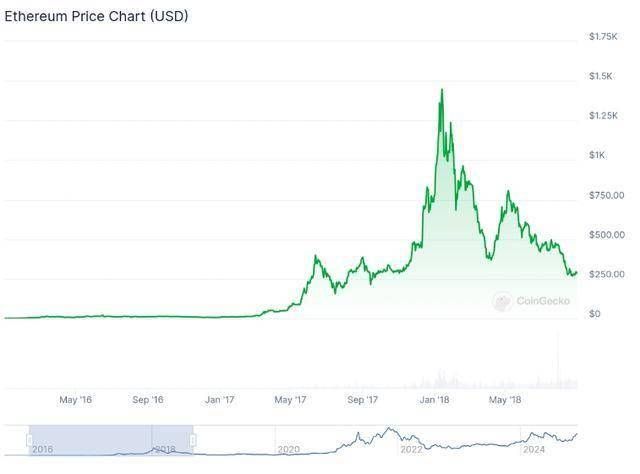 在这一时期,许多altcoin显示出指数级增长。以太坊从2017年1月的约8美元增长到2018年1月的超过1400美元,其智能合约功能和在ico中的广泛应用是主要触发因素之一。