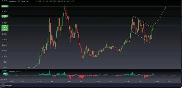 价格可能在3400美元上方进行整固,这对于以太坊可能是一个买入机会。这可能预示着eth价格在4100美元和4800美元之间的潜在上涨。