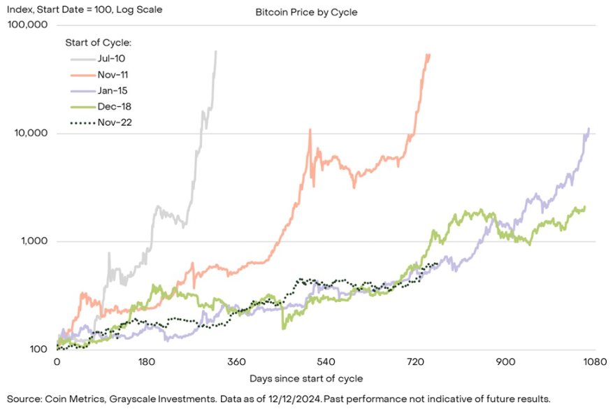 grayscale research 认为当前市场正处于新一轮加密周期的中期阶段。只要基本面(如应用采用和宏观市场条件)可靠,牛市就有可能延续到 2025 年甚至更久。