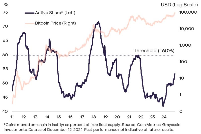 图 5 :过去一年活跃的比特币与流通量的比率不到 60%