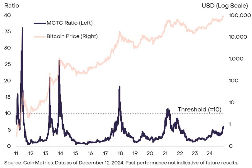 比特币矿工的行为常常是市场周期中的一个重要信号。矿工市值与矿工通过区块奖励和交易费所得比特币累计价值的比率(mctc)是衡量矿工在周期中的行为的重要指标。当这一比率超过10时,往往意味着矿工开始获利了结,市场价格趋于见顶。