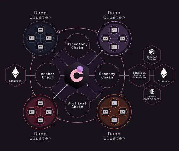 模组化结构不是单一区块链,而是由不同的区块链组成,让它具备更好的可扩展性和弹性架构,包含dapp 集群(每个dapp 都有自己的专属链)、目录链(directory)负责网路管理、经济链(economy)管理代币经济、锚定链(anchor)负责验证最终状态等