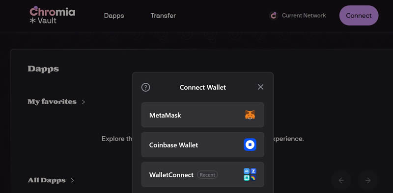 chromia vault 与其说是钱包,不如说是官方提供的操作介面,依然需要连接钱包,目前官方推荐用来操作chromia 的钱包是metamask,但其他evm 钱包也可试试。
