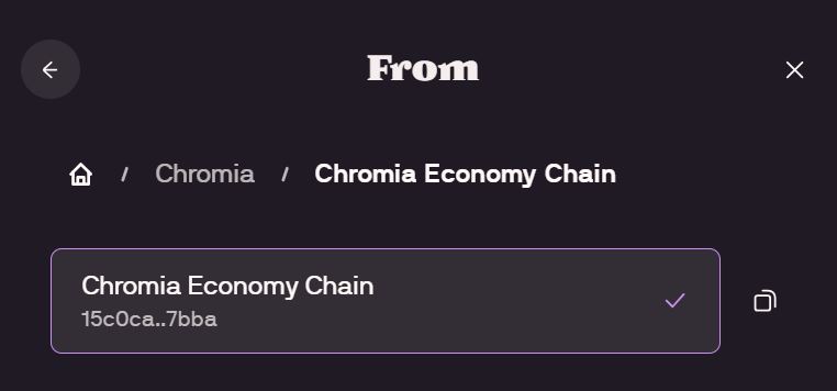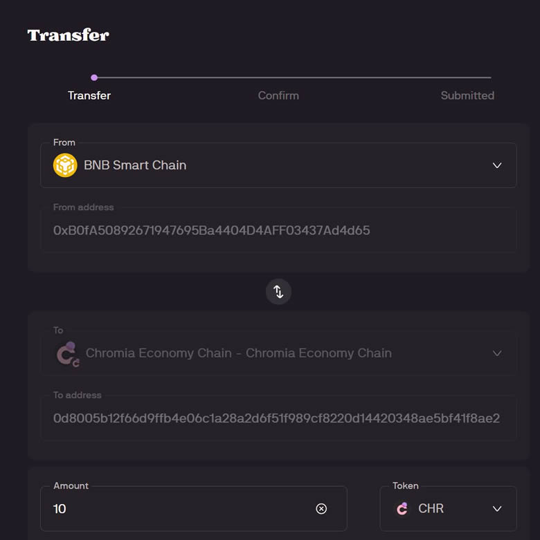 上方选择目标链,会自动抓钱包中地址,下方是目标,如果是同钱包跨链,选链之后地址会自动出现,如果是chromia 链间转帐,下方要贴上目标地址。
