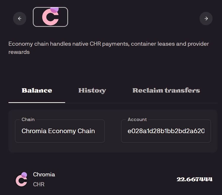 可看到下方chromia economy chain 的地址会自动出现,chromia 链上地址是根据钱包私钥算出,地址已存在,只是需要注册去启动它。