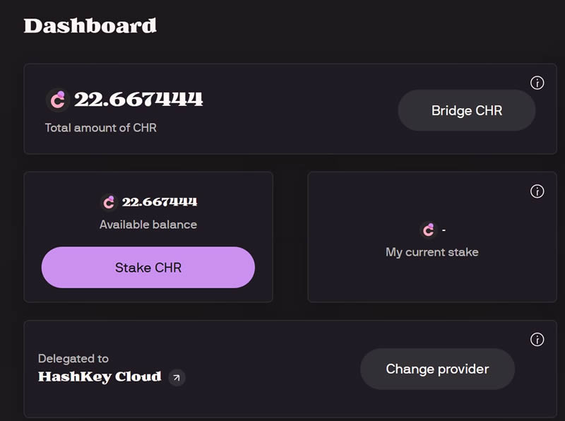 如果chromia 链上还没有币,按下bridge chr 进行跨链;已有币,按下stake chr 进行质押,输入数量质押后只是将币锁定,还有最后一步委托节点才算完成质押。