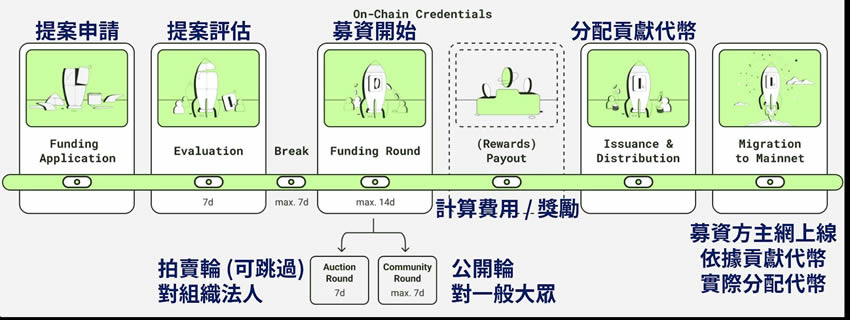 募资轮次可概分为两种,针对专业投资人与机构法人的拍卖轮次(可跳过),以及针对大众的公开社群轮次,参与代币由项目方设定,通常为$dot 、$usdt、$usdc 等