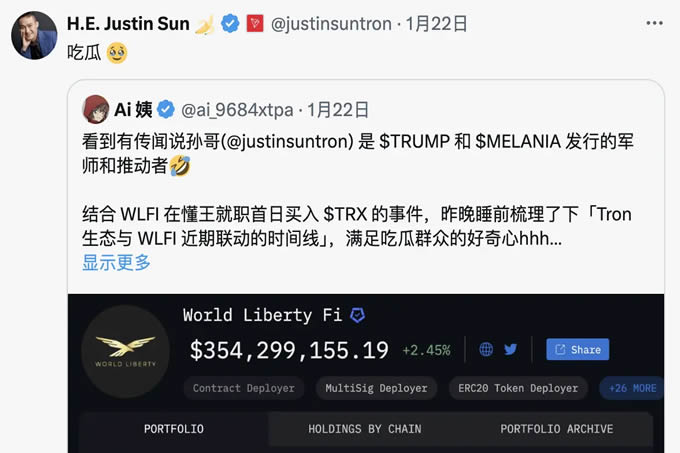 而孙宇晨因特朗 普发币前后,和特 朗普加密项目wlfi和meme币的紧密互动,也引起市场猜测,他也是此次特 朗普发币背后的关键指导者。