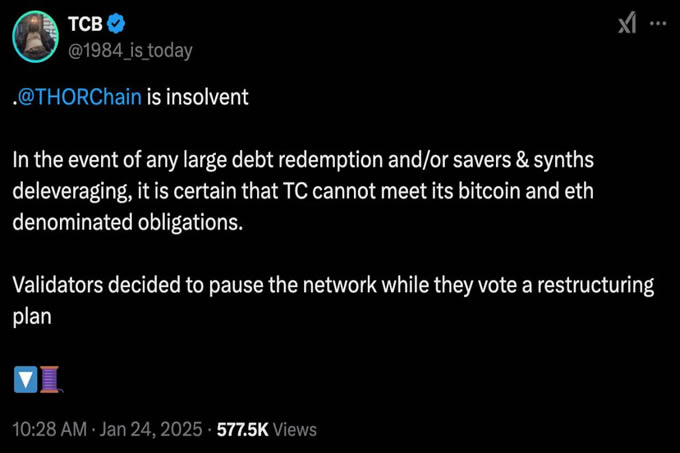 社群媒体x上的用户tcb指出,thorchain为了解决其「储蓄与借贷」服务中累积难以偿还的债务,将暂停其thorfi服务,并启动为期90天的重组计划,仅剩跨链等基本交易功能持续运作。