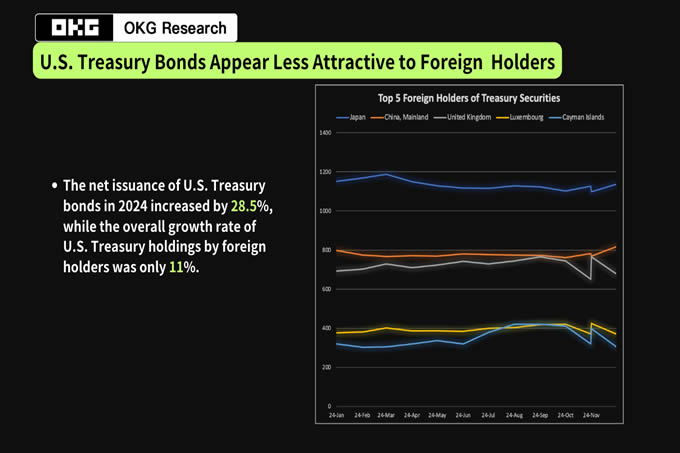 okg research特别策划推出“特 朗普经济学”系列专题,深入分析这一进程的核心逻辑以及未来趋势。第一篇《特朗 普再任:新政经济时代的比特币、石油与黄金》聚焦比特币对国际金融格局的影响。本篇则从美债这一传统金融核心资产切入,深入剖析规模高达36万亿美元的美债市场,如何借助区块链技术和加密领域的工具,进一步巩固和扩展美元在全球金融体系中的主导地位。
