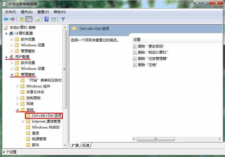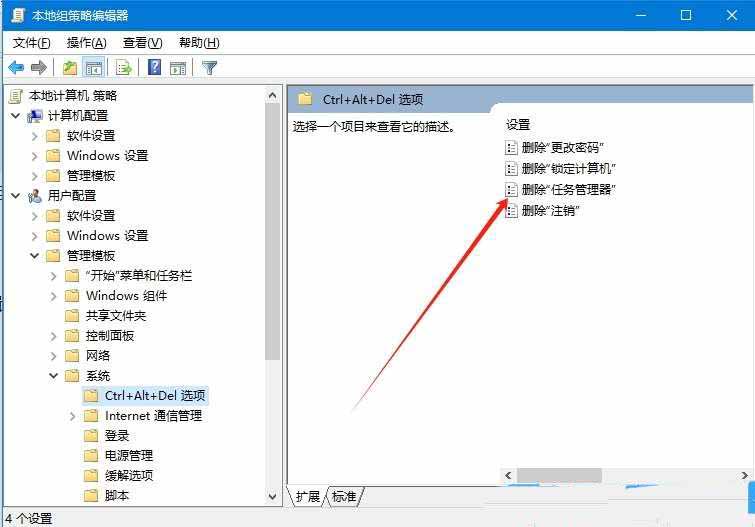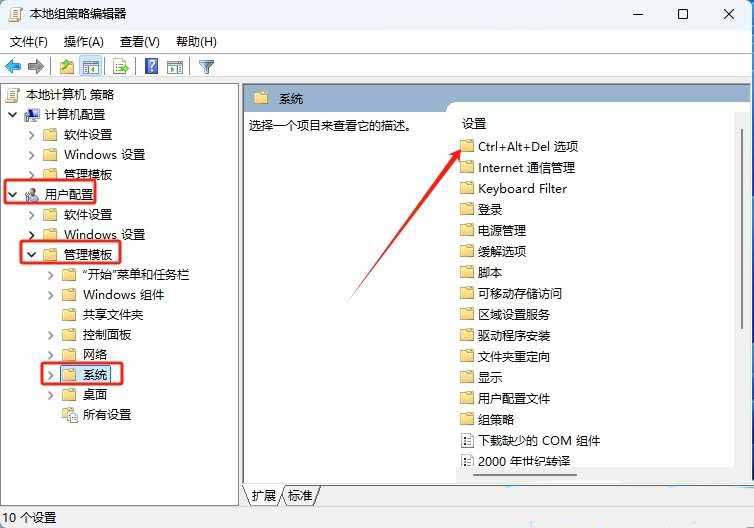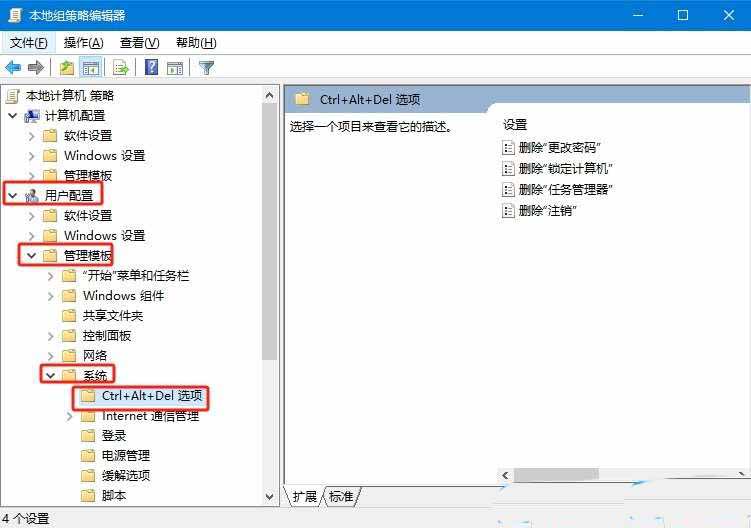 2、接着,依次点击展开“用户配置-管理模板-系统-ctrl+alt+del选项”。