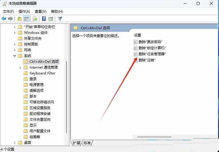 3、然后,双击右侧中的“删除任务管理器”策略。