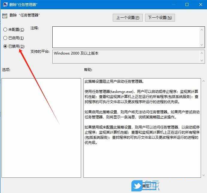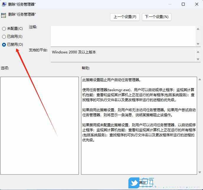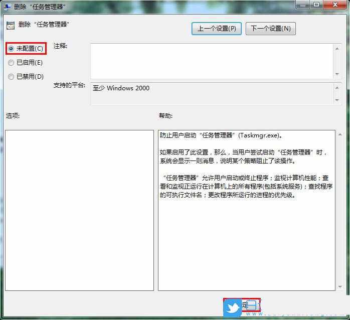 5、删除任务管理器,这里有个帮助,说的是:防止用户启动任务管理器,如果启用了此设置,那么,当用户尝试启动任务管理器时,系统会显示一则消息,说明某个策略阻止了该操作。任务管理器允许用户启动或终止程序;监视计算机性能;查看和监视正运行在计算机上的所有程序(包括系统服务);查找程序的可执行文件名;更改程序所运行的进程的优先级。在删除任务管理器窗口,选择未配置,最后点击确定即可;