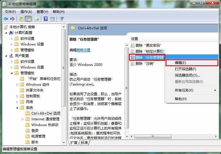 4、右键点击删除任务管理器,在打开的菜单项中选择编辑,或直接双击打开会更加方便;