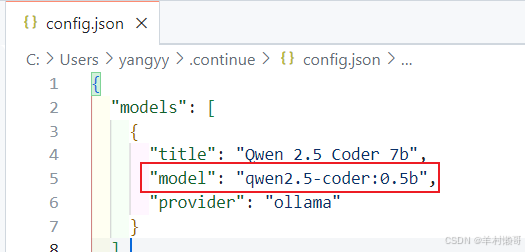 8. 我的本地下的时0.5b版本,将model这里修改一下即可,上面的title只是一个名字可以不用管,保存一下