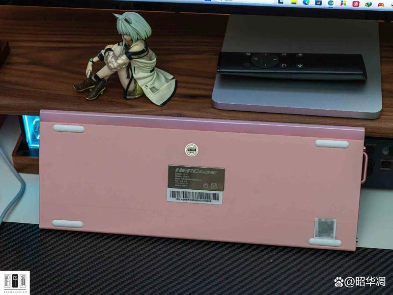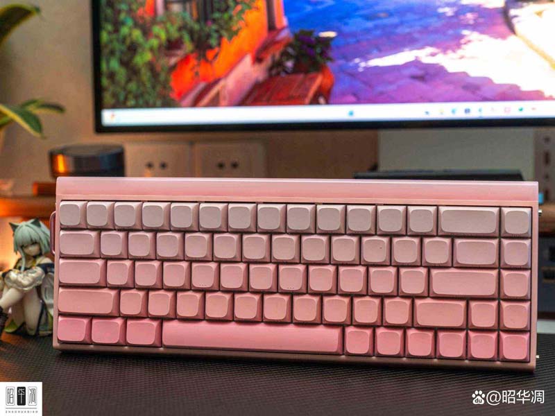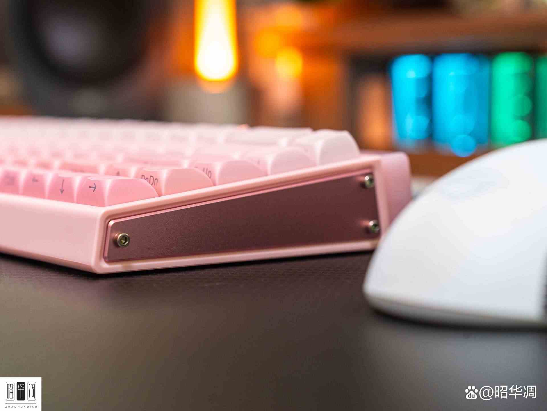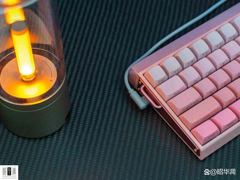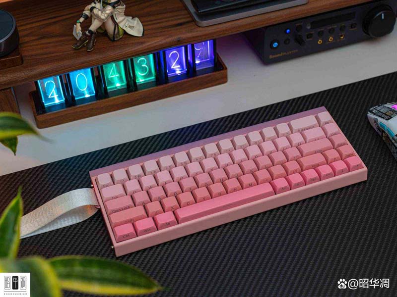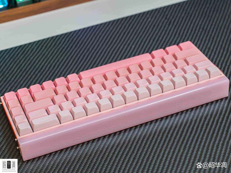 狼蛛 hero 68he 共有 8 种版本,主要区别键帽轴体以及配色。我这套是黑皇磁轴粉色 mda 渐变版,少女心拉满的粉红以渐变色的形式逐次降低饱和度,侧刻字符让整体清新简洁,视觉表现相当舒适,细节上也很有高端质感。