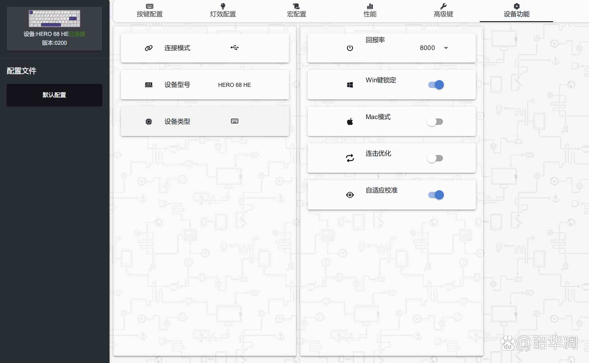 设备功能中还包含 mac 模式切换、win 键锁定、连击优化和自适应校准等功能。此外,键盘的回报率最高可达 8000hz,是普通有线键盘的 64 倍,非常适合电竞选手使用。