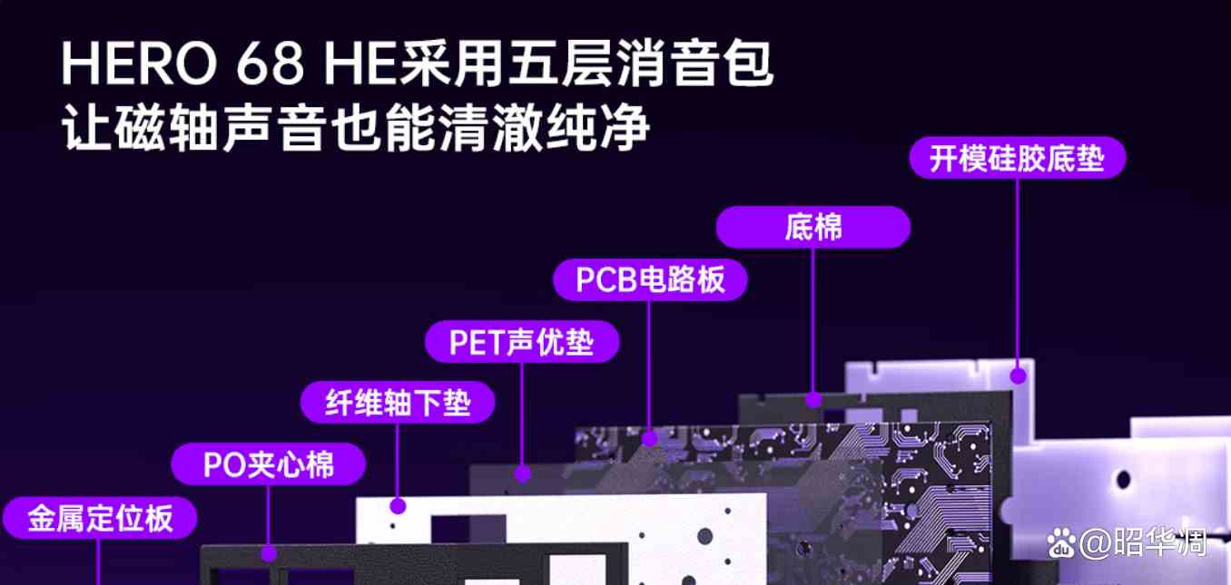 内部结构上此外,键盘配备了 五 层声音填充包,包括 po 夹心棉、纤维轴下垫、pet 声优膜、开模硅胶底垫和底棉,有效减少了空腔音,让磁轴也能拥有 hifi 音效。