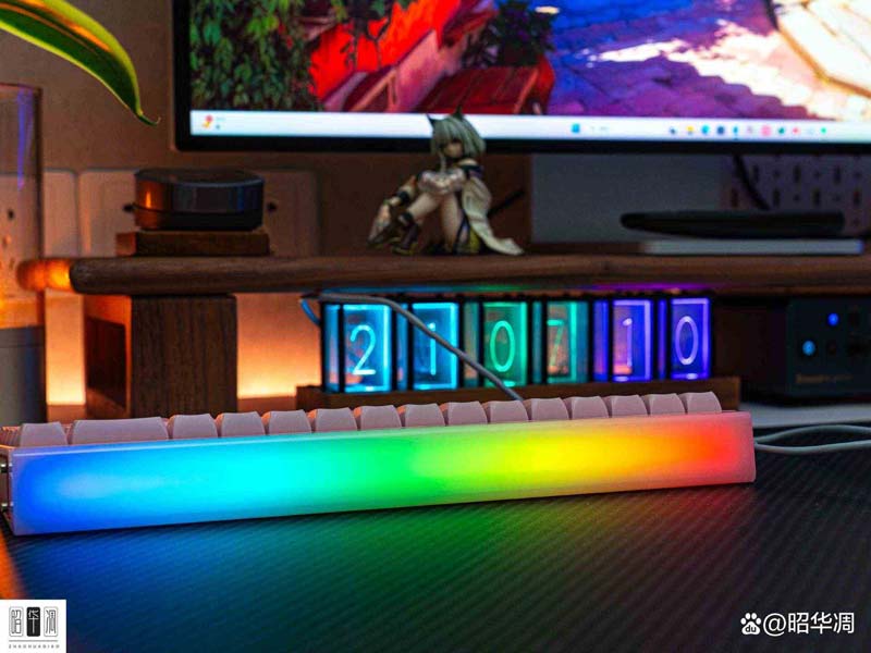 当 rgb 灯效亮起,才是这把键盘灵魂所在。而且键盘虽然配备了大面积灯箱,但键帽仅仅字符透光,不会出现那种夸张到爆的刺眼感,整体还是较为内敛的,