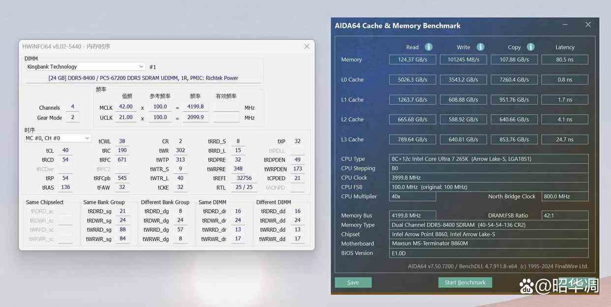 然后是金百达白刃 xmp 8400mhz ,同样正常开机,此时读取速度为 124.37gb/s、 写入速度为 101245mb/s、拷贝速度为 107.88gb/s、 延迟为 80.5ns