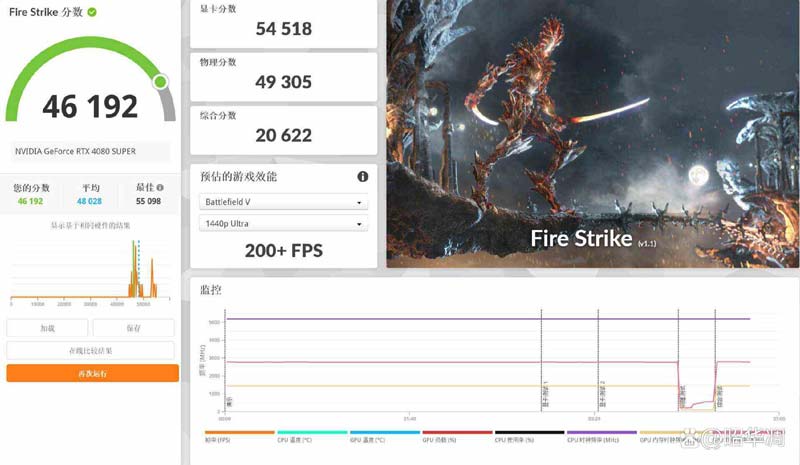 首先是常规的 3d mark,基于 directx 11 的 fire strike 模组整机总得分为 46192分,其中显卡分数 54518分,物理分数 49305分,综合得分 20622。
