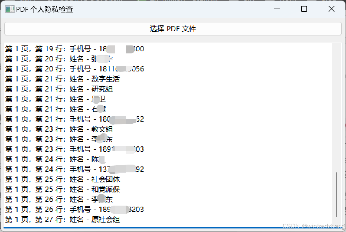 我们的目标是开发一个简单的桌面应用程序,该程序能够加载pdf文件,并检查其中是否包含特定的隐私信息。如果检测到这些信息,程序将显示它们的具体位置(页码和行号)。