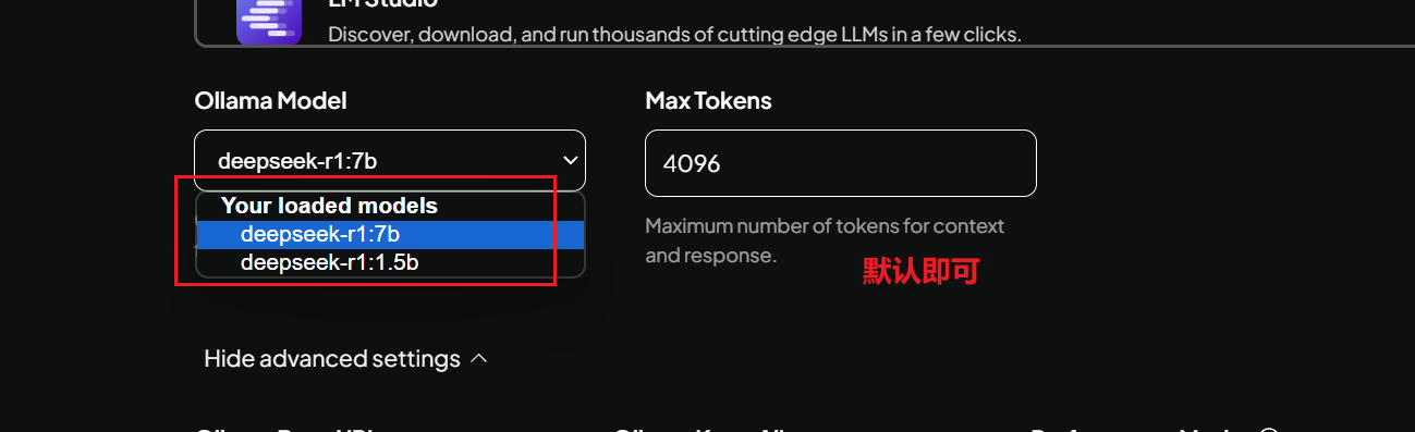 - 选择本地 ollama 模型方式,软件会自动识别你之前下载的 deepseek 模型。