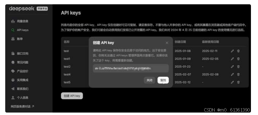 访问 deepseek 官网,点击右上角的“开放平台”,注册或登录账号。在左侧菜单中点击“api keys”,点击“创建 api key”,为 api key 命名(如“test”),然后创建。系统会生成一个 api key,请务必复制并妥善保存,因为之后无法再次查看。