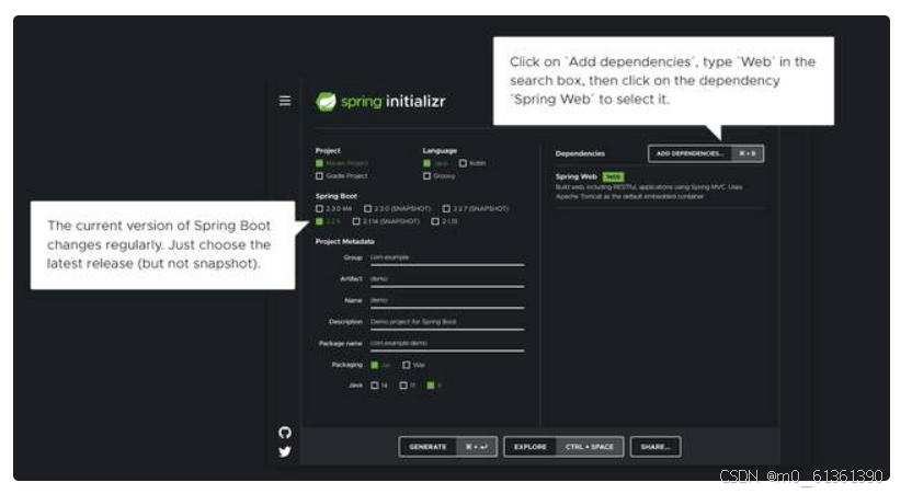 使用 spring initializr 创建一个新的 spring boot 项目,选择以下依赖:spring web、spring data jpa 等。确保选择的 spring boot 版本为 3.2.x 或更高。